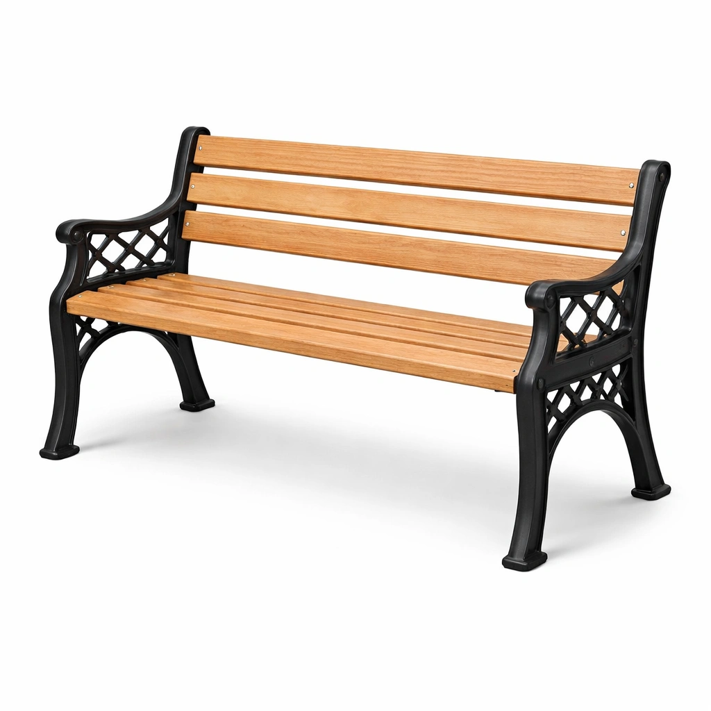 Banco hecho de madera de acacia y hierro fundido para uso exterior.