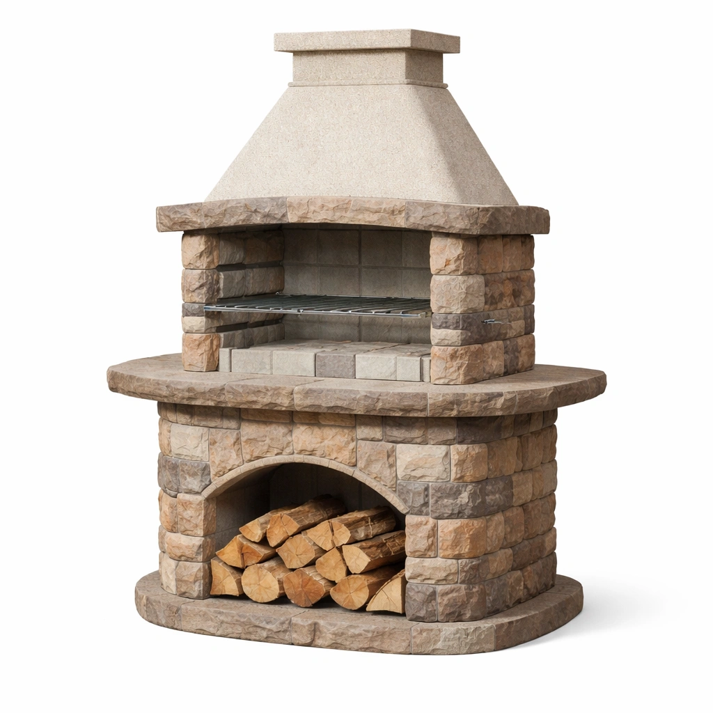 Material: Estructura de piedra natural con parrilla de acero inoxidable.