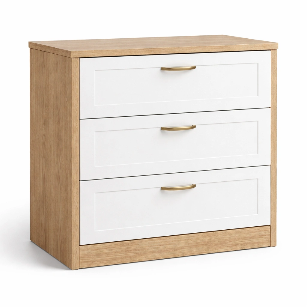 Esta cajonera cuenta con una estructura de madera contrachapada y frentes de cajones de MDF lacado. Los tiradores son de aleación de zinc.