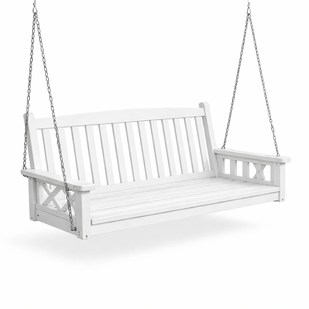 El columpio está fabricado con madera de pino tratada para exteriores. Mide 150 cm de largo, 60 cm de ancho y 55 cm de alto. Peso de 20 kg y soporta hasta 250 kg. Color Blanco.